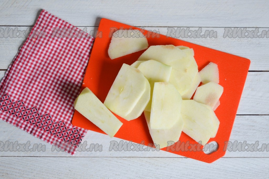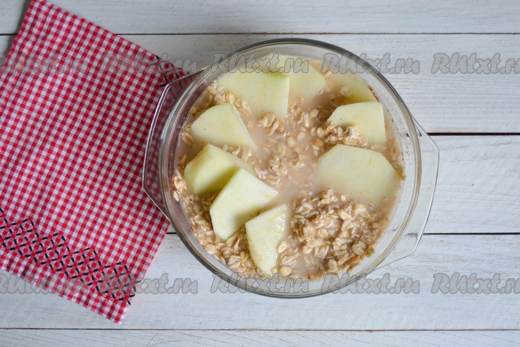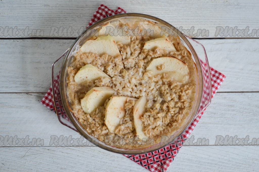 Яблочные ломтики выложить в форму поверх овсянки, немного вжимая и накладывая друг на друга.