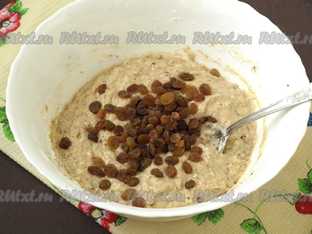 Затем добавить предварительно промытый и обсушенный изюм, перемешать тесто. Консистенция теста - густая сметана.