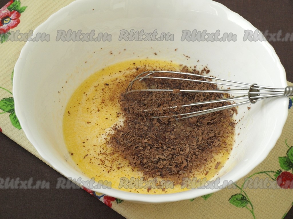 Добавить в массу молоко, растопленное и остуженное сливочное масло. Всыпать натёртый на тёрке шоколад. Если не любите чёрный шоколад, замените его на молочный.