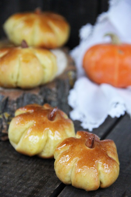Перед выпеканием вставить в середину каждой булочки орешек. Выпекать тыквенные булочки в разогретой духовке при температуре 200 градусов, примерно, 30 минут.