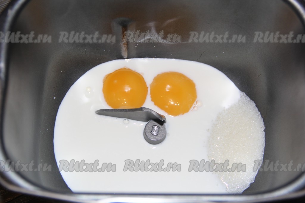 Молоко подогреть до 40 градусов. Я замес теста делала в хлебопечке. В ведёрко хлебопечки влить тёплое молоко, добавить желтки и сахар.