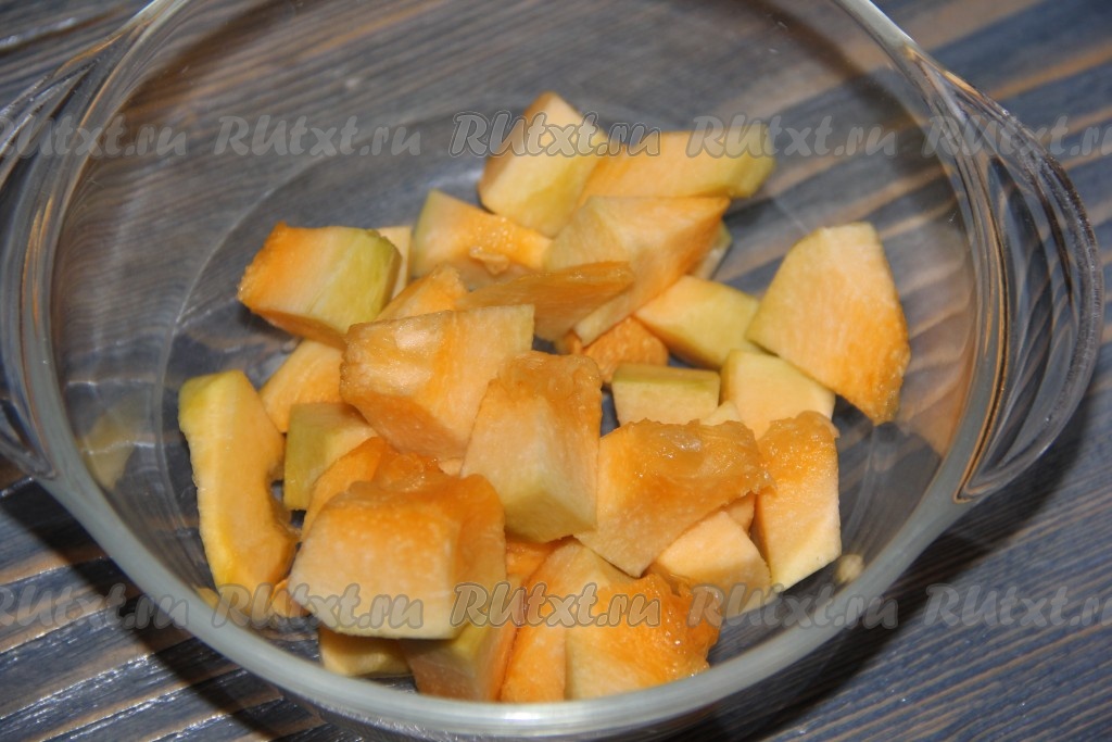 150 грамм очищенной тыквы нарезать на кубики. Запечь тыкву в микроволновке при максимальной мощности в течение 7 минут (до мягкости).