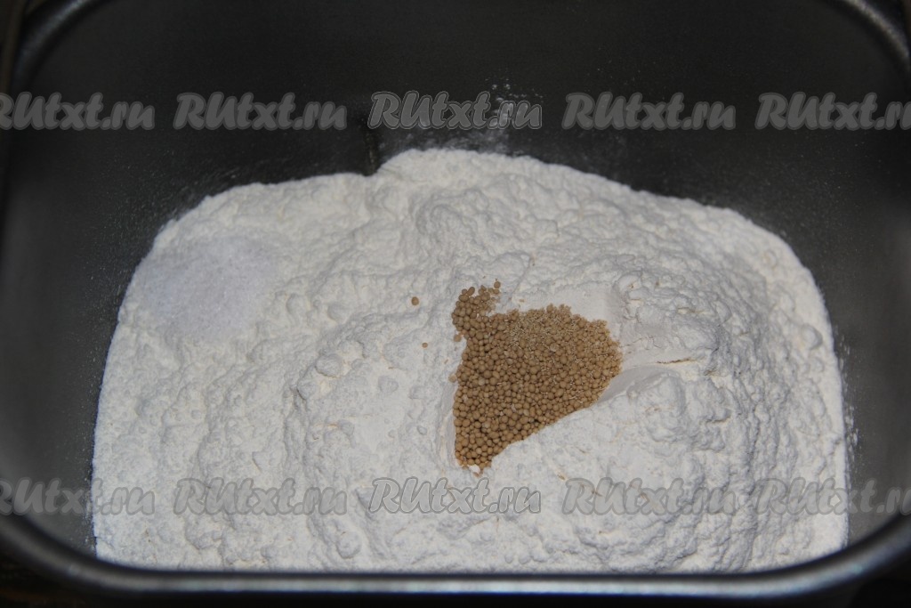 Затем всыпать в ведёрко муку, соль и дрожжи. Выставить режим "Замес теста", он у меня занимает 1,5 часа.