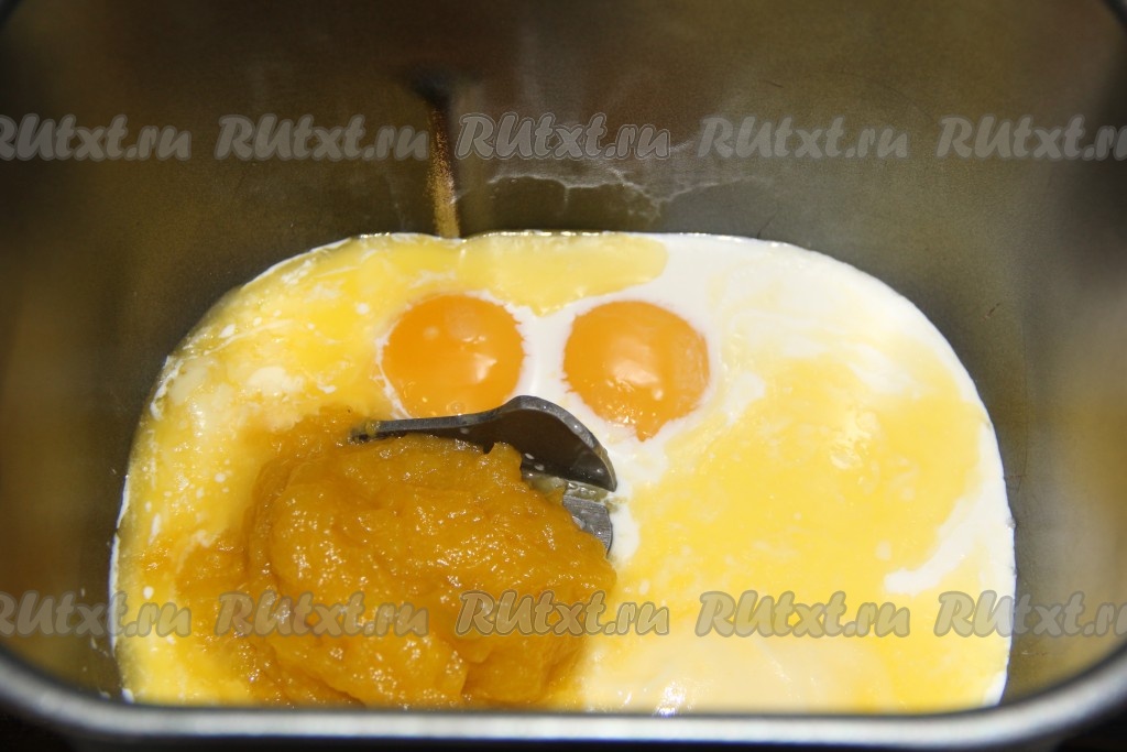 Добавить растопленное не горячее сливочное масло и тыквенное пюре в ведёрко.