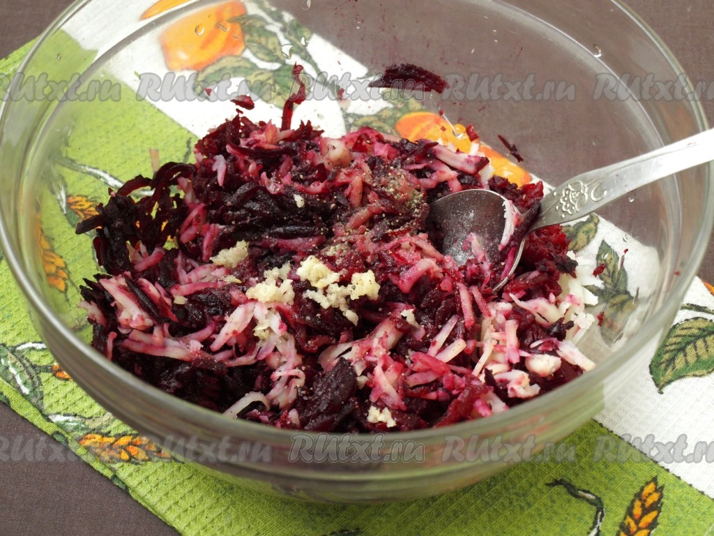 Добавить к натертым овощам соль и перец, перемешать и выдавить чеснок.