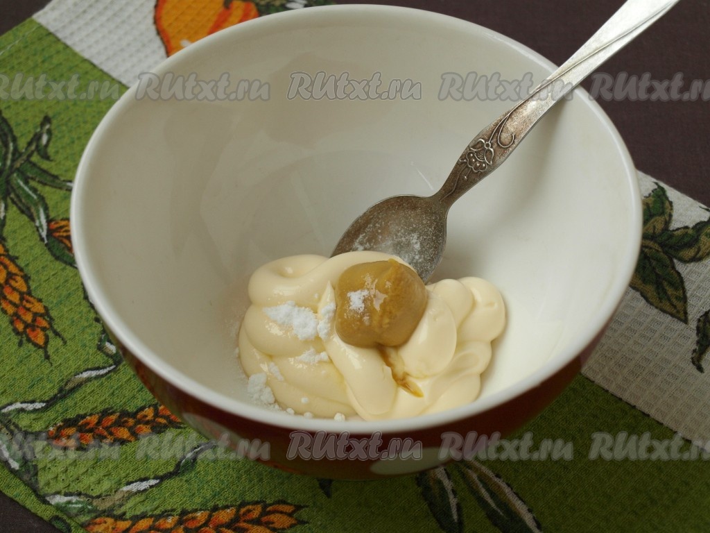 В отдельной посуде смешать майонез, горчицу и сахарную пудру, масса должна стать однородной. Заправка для салата готова.