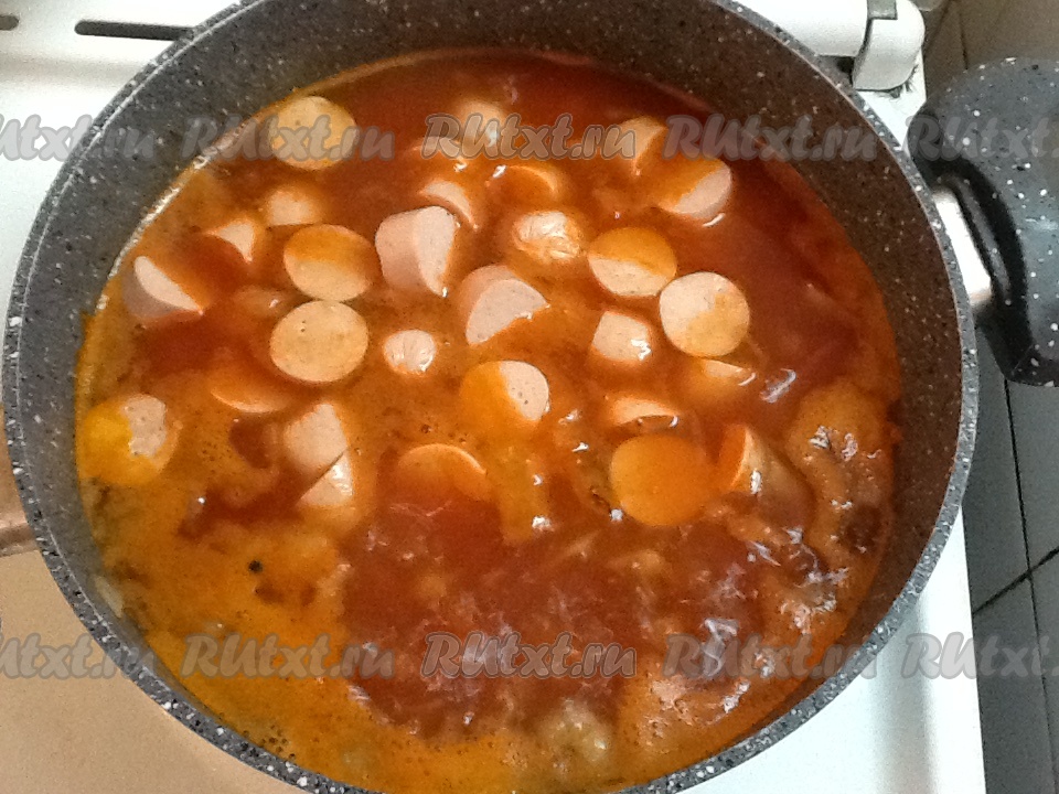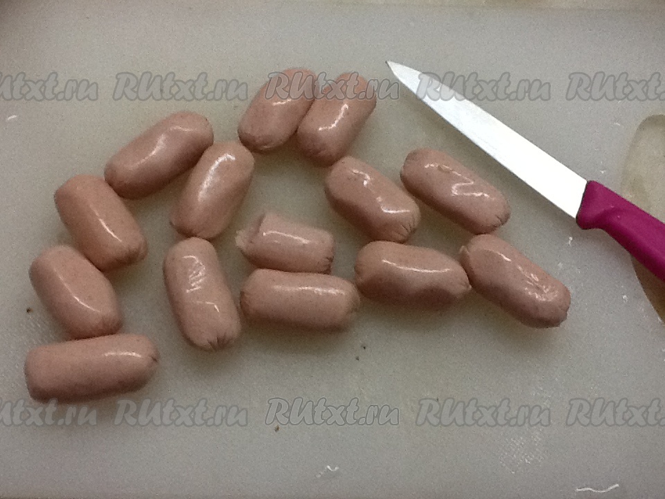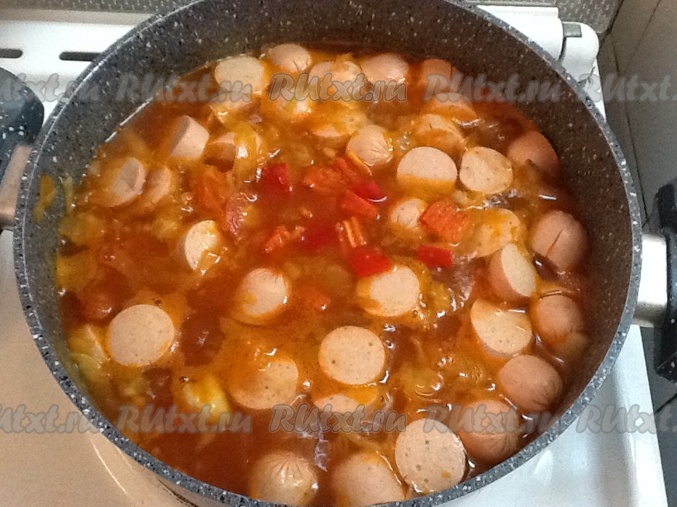 Нарезаем сосиски и отправляем вслед за квашеной капустой и томатом.