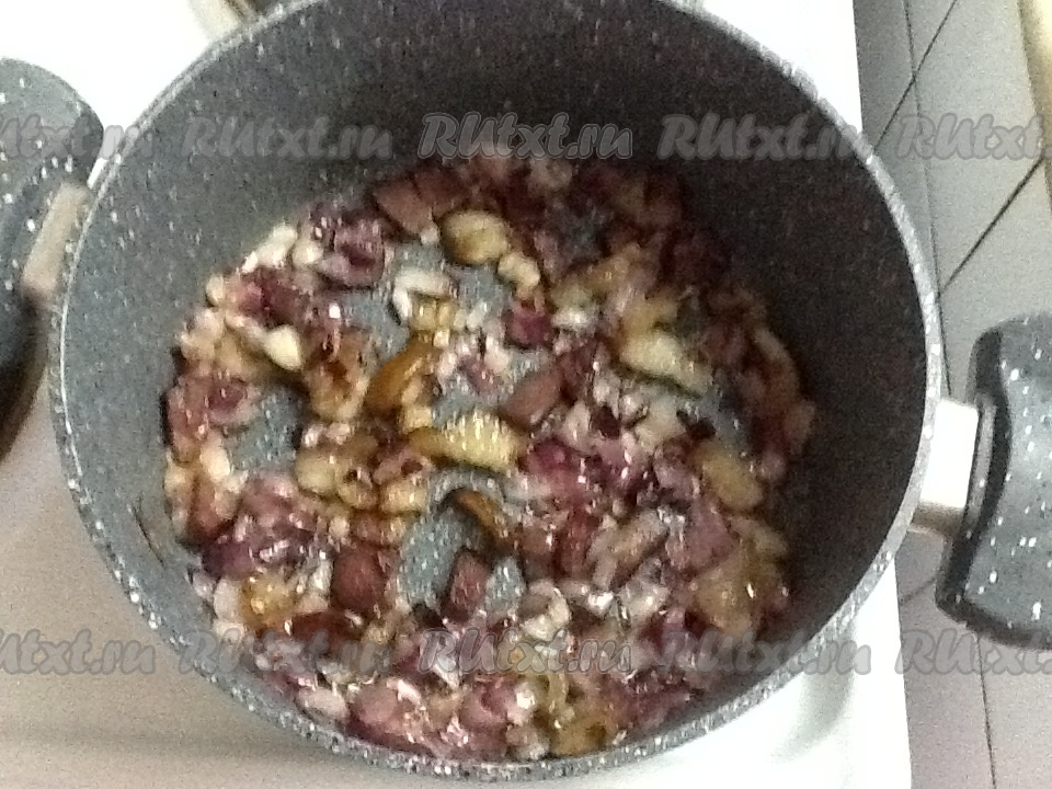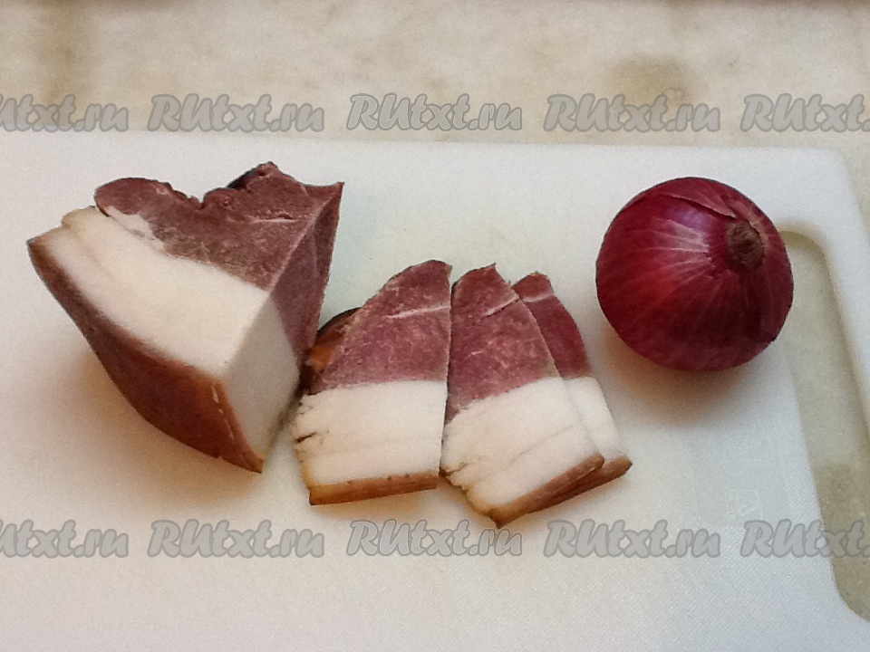 Нарезаем очищенный лук, копчёное мясо с салом и обжариваем все вместе в кастрюле, в которой будут вариться щи.