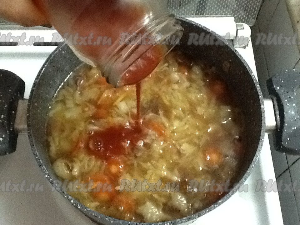 Хорошо перемешиваем и добавляем в кастрюлю томатную пасту.