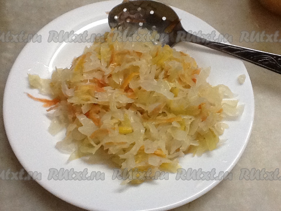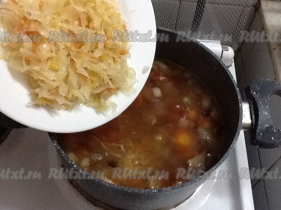 По истечении времени квашеную капусту слегка отжимаем от лишней жидкости и добавляем в кастрюлю.