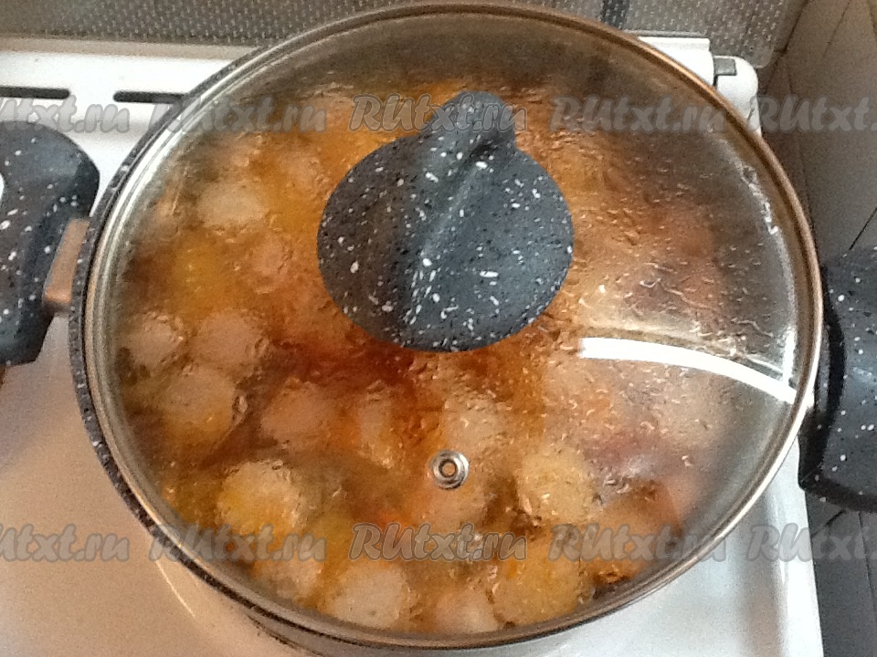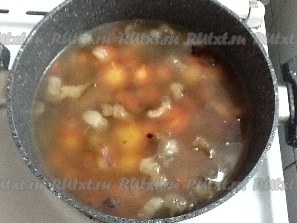 Когда лук обжарится до золотистого цвета, добавляем в кастрюлю горячую кипячёную воду и высыпаем туда картошку с морковкой, подсаливаем и варим на среднем огне, примерно, 10 минут.