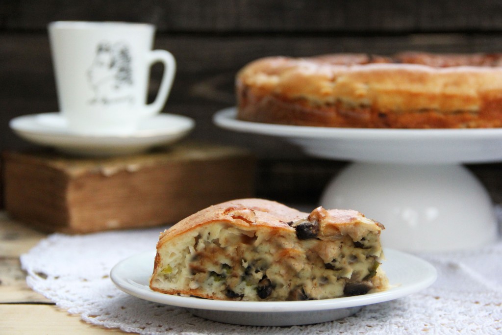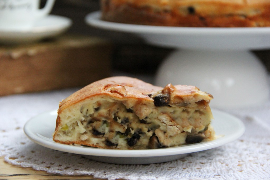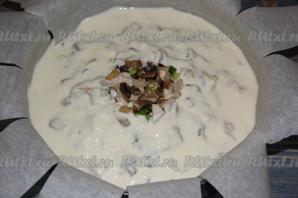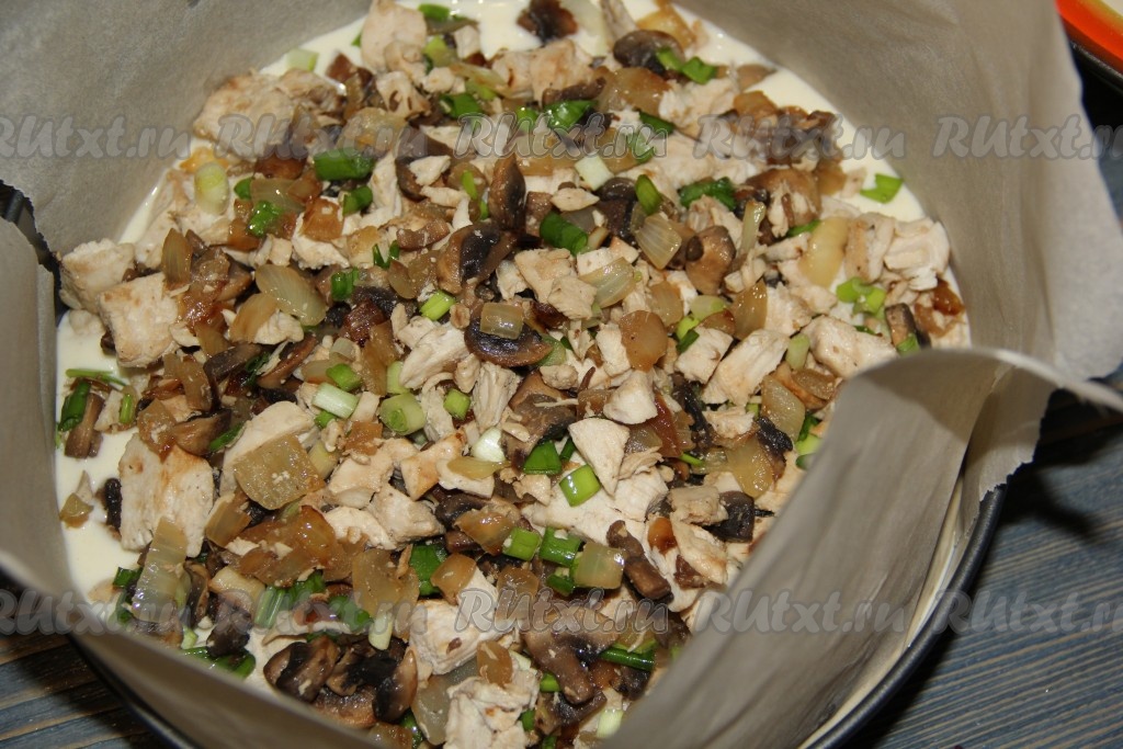 Выпекать заливной пирог с курицей и грибами в разогретой духовке при температуре 200 градусов, примерно, 45-50 минут. Пирог станет красивого золотистого цвета.