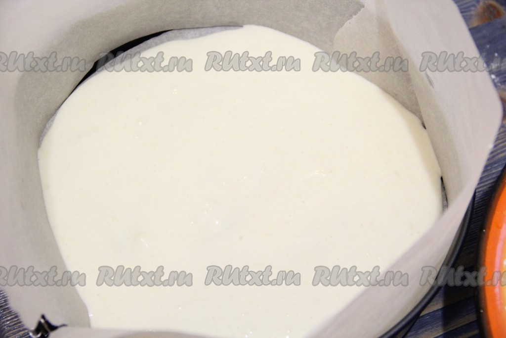 Форму для выпекания выстелить пергаментом. Я использовала разъёмную форму диаметром 26 см. Вылить 1/2 теста на дно формы.