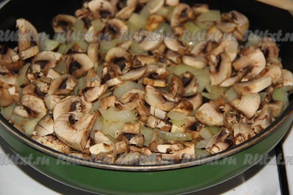 Шампиньоны промыть под проточной водой и нарезать на тонкие пластинки. Добавить грибы в сковороду к луку и обжарить в течение 10 минут, помешивая.