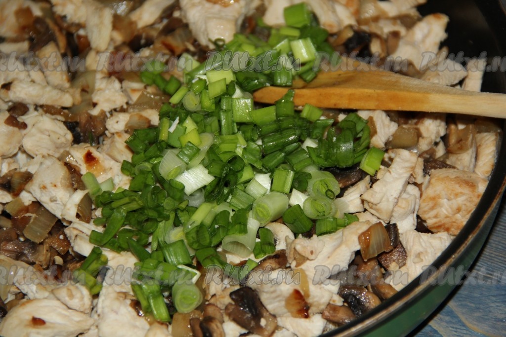 Куриное филе нарезать на мелкие кусочки, добавить в сковороду к грибам и луку. Посолить, поперчить начинку для пирога и обжарить в течение 5 минут, помешивая, затем снять сковороду с огня.