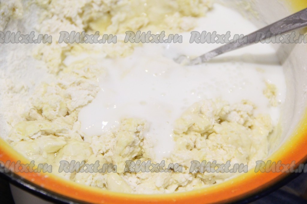 Слегка перемешать массу ложкой, а затем постепенно влить кефир, перемешивая тесто венчиком.