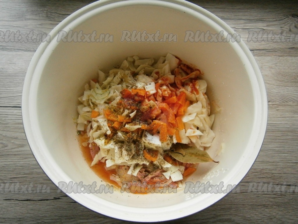 Добавить в чашу мультиварки к капусте и колбасе томатную пасту, соль, специи, сахар, лавровый лист и влить оставшуюся воду.