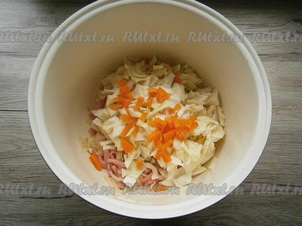 Далее добавить в чашу нарезанную "чашечками" или кусочками белокочанную капусту и нарезанную брусочками очищенную морковь.