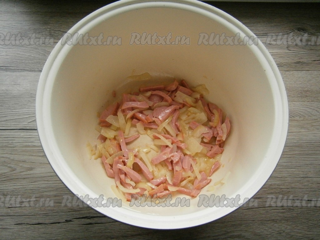 Выставить режим "Жарка" или "Выпечка" на 20 минут. Обжаривать лук, помешивая, 10 минут. После этого добавить к луку нарезанную брусочками или кусочками вареную колбасу, обжаривать далее еще 10 минут, периодически перемешивая.