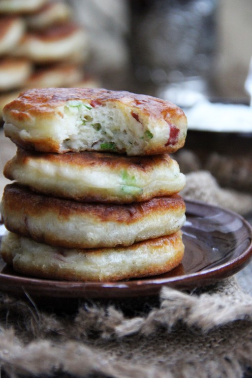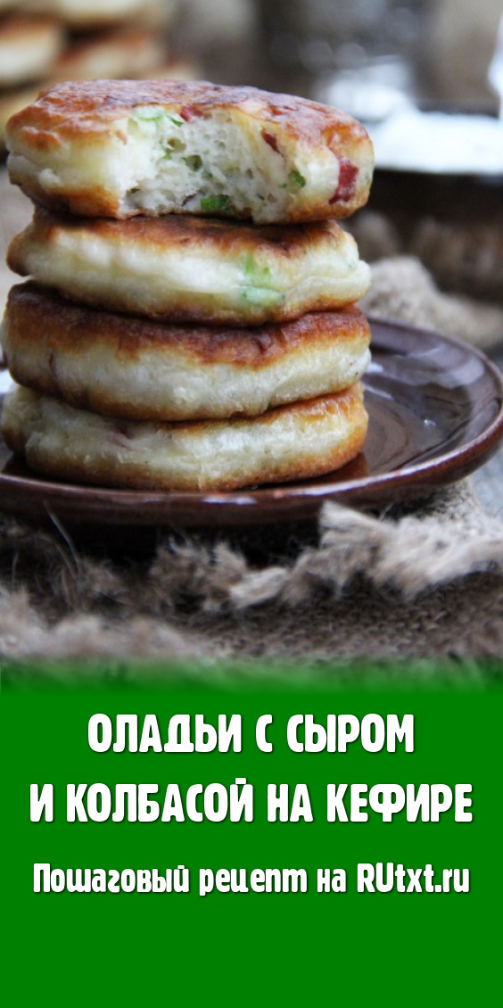 Готовые оладьи выложить на бумажное полотенце, чтобы удалить излишки масла. Подать оладушки в горячем виде со сметаной. Оладьи с сыром и колбасой, замешанные на кефире, получаются очень вкусными и пышными.
