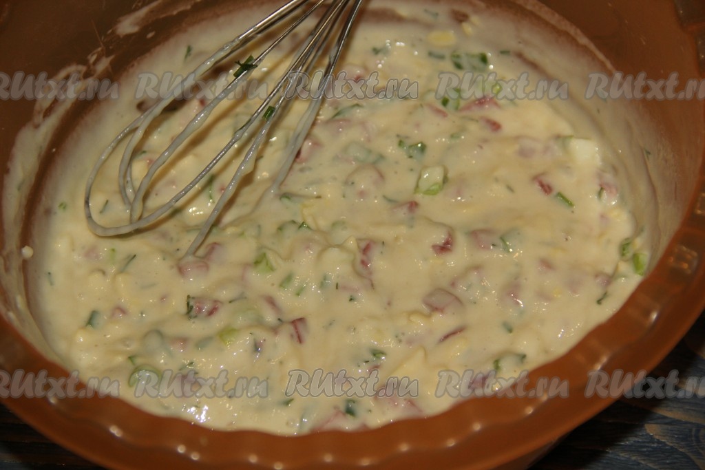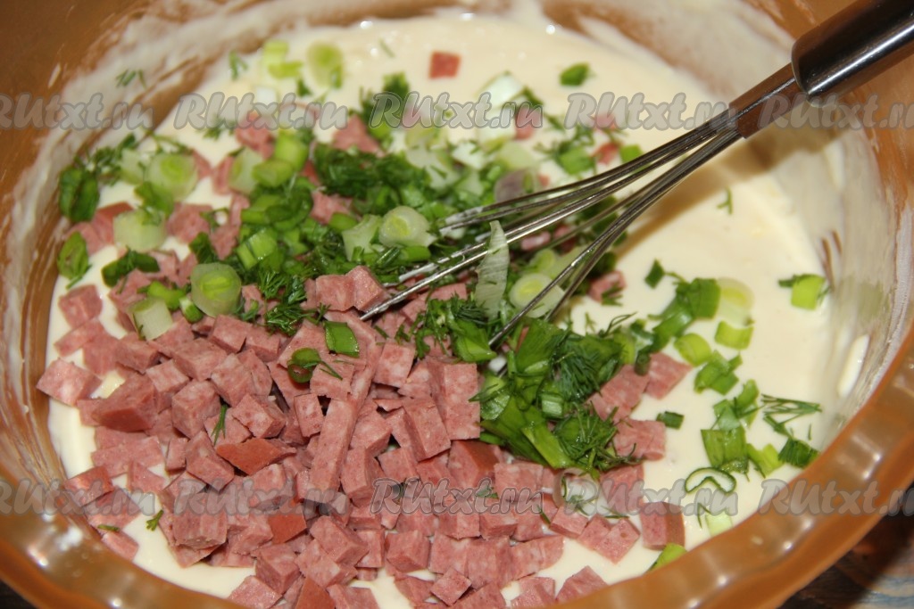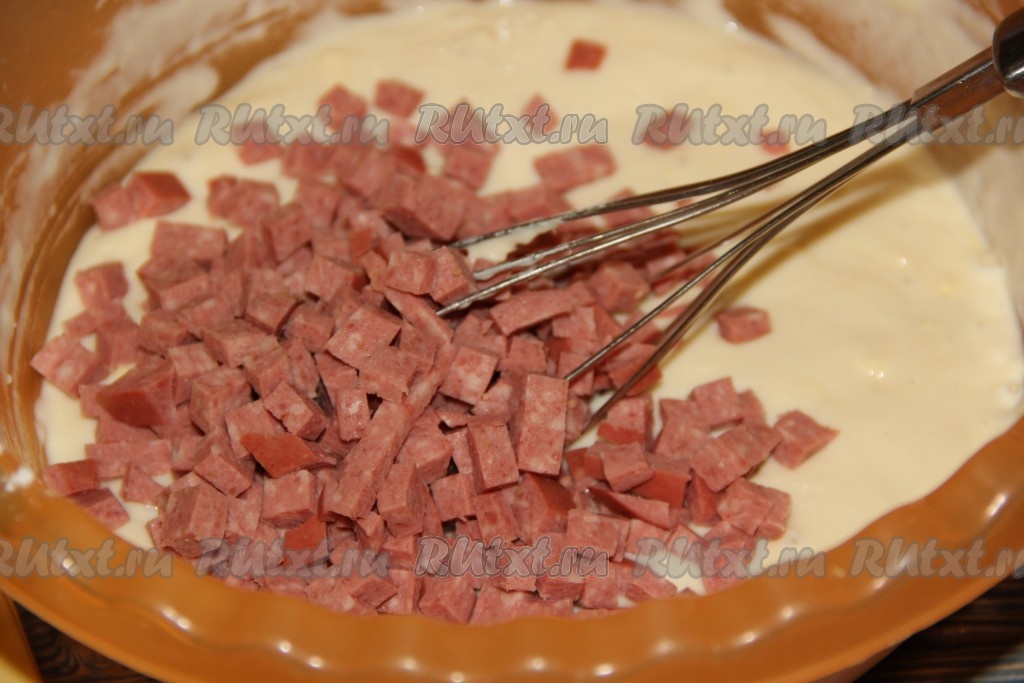 Колбасу, нарезанную мелкими кубиками, тоже добавить в тесто.