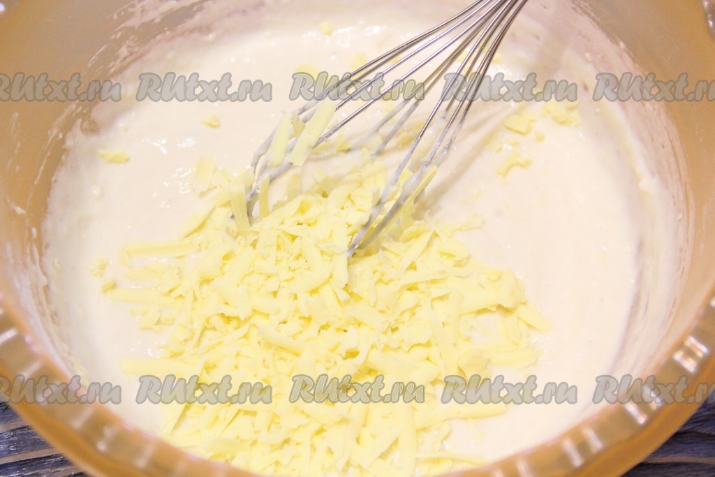 Сыр, натертый на крупной тёрке, выложить в тесто и хорошо перемешать.