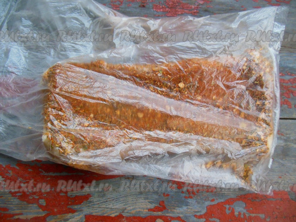 Кусочек сала положите в чистый пакет, добавьте специи, снова потрясите пакет. При таком способе приготовления даже руки остаются чистыми. Уберите пакет с салом в морозилку, через сутки ароматное сало будет готово.