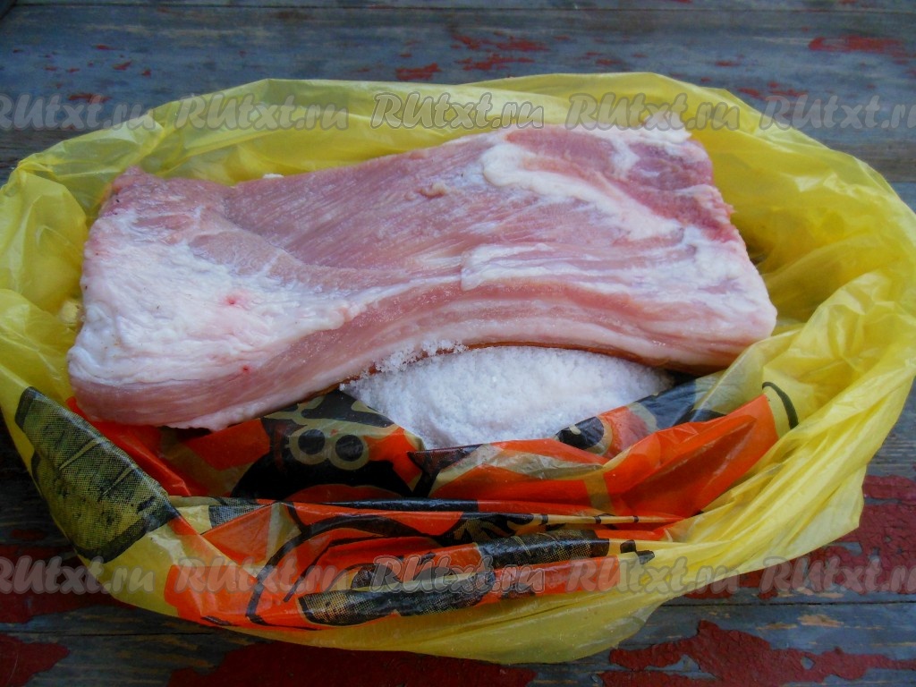 Сало промойте проточной водой, хорошо зачистите ножом со всех сторон, а затем обсушите при помощи бумажного полотенца. На дно пакета насыпьте соль, затем положите сало.