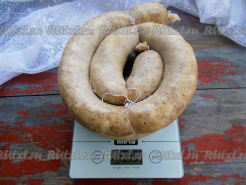 Из 1,6 килограмма куриного фарша у меня получилось три домашних куриных колбаски весом 1,343 килограмма. Отваренную колбасу можно заморозить, а потом, слегка разморозив, просто поджарить.