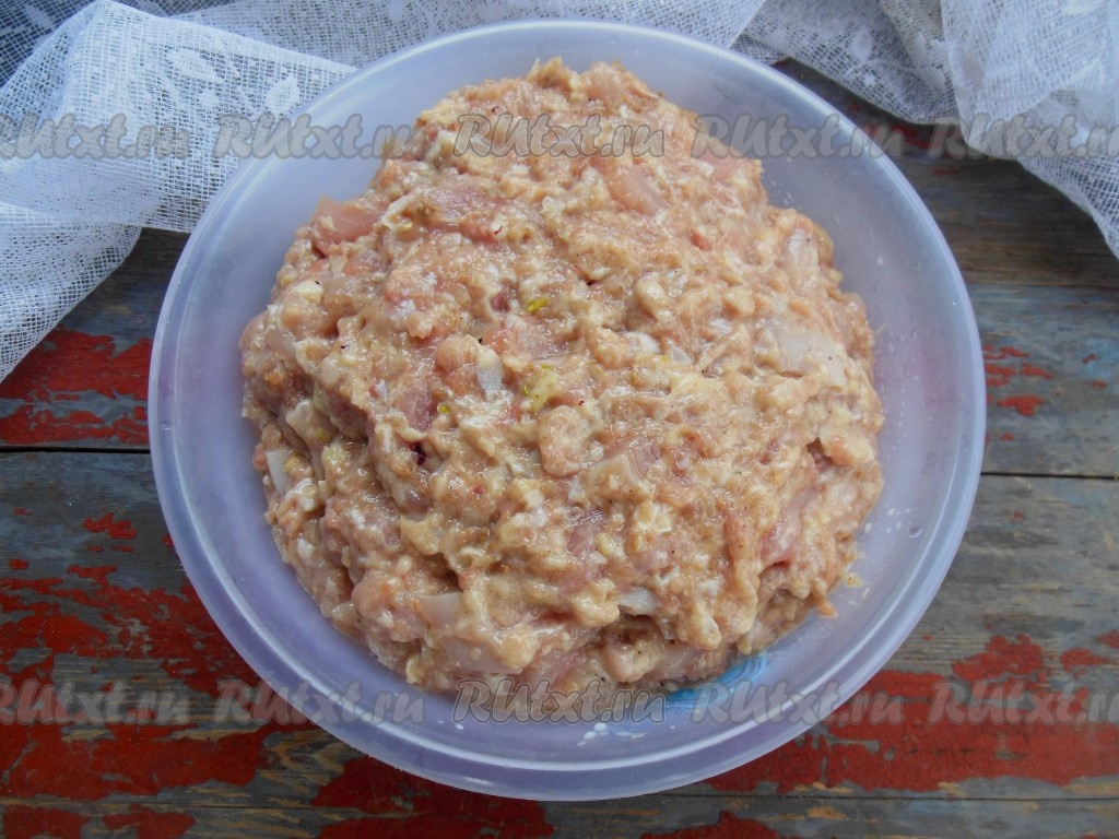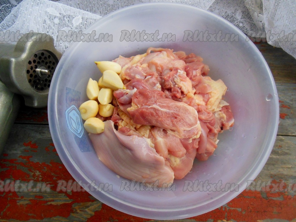 Шкуру, мякоть (куриную грудку перекручивать не нужно) и чеснок измельчите с помощью мясорубки.