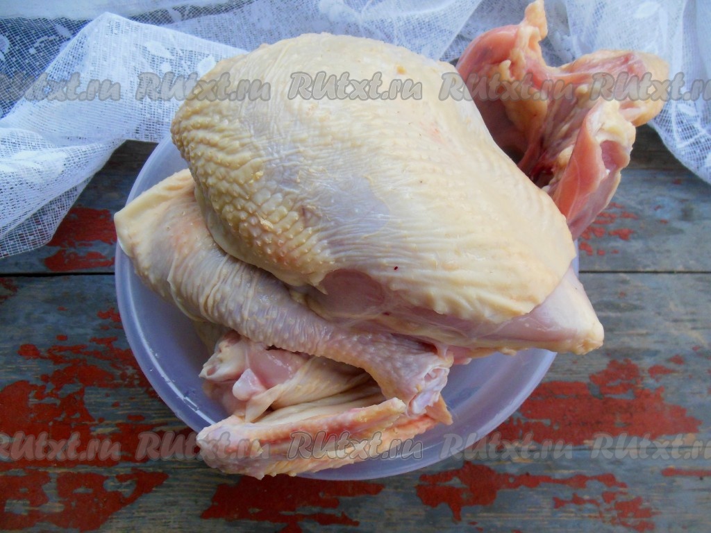 Разделите курицу на кусочки, снимите шкуру и мякоть с костей. Мякоть с куриной грудки отложите отдельно. Кости можно использовать для приготовления первого блюда.