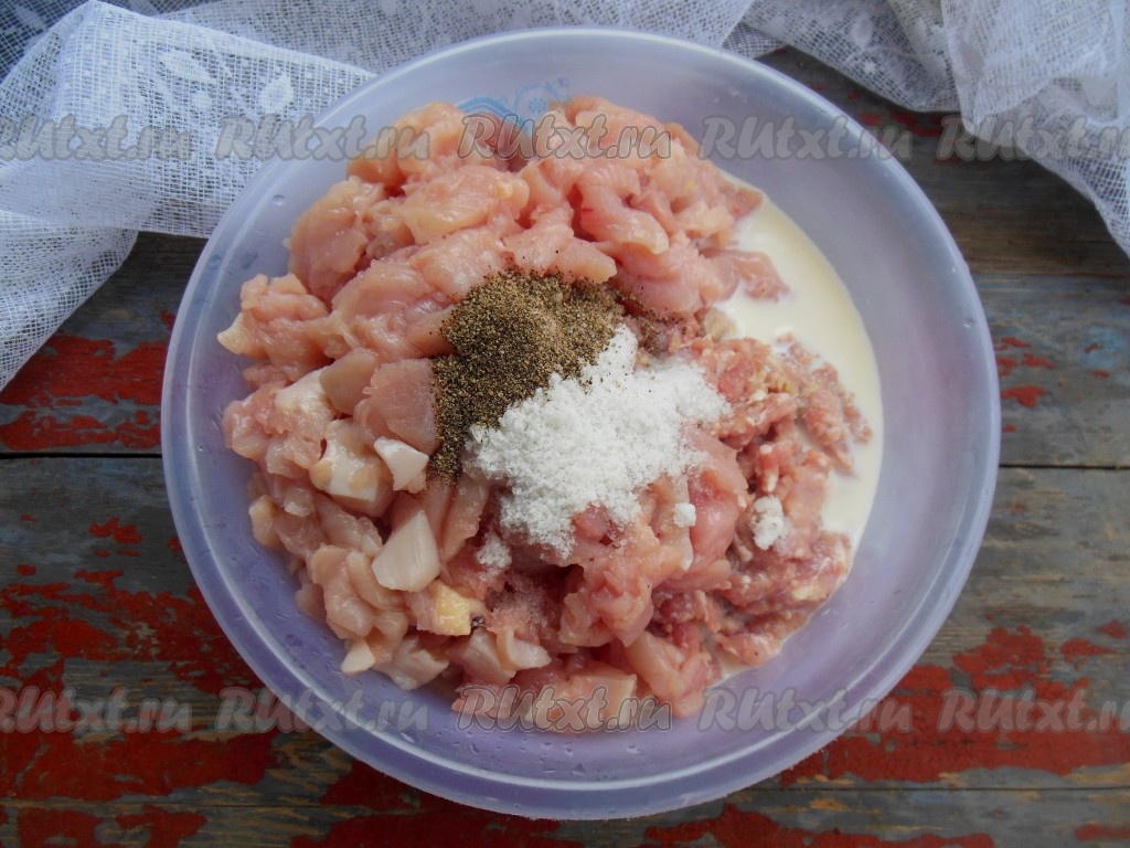 Куриную грудку без кожицы нарежьте на мелкие кусочки.