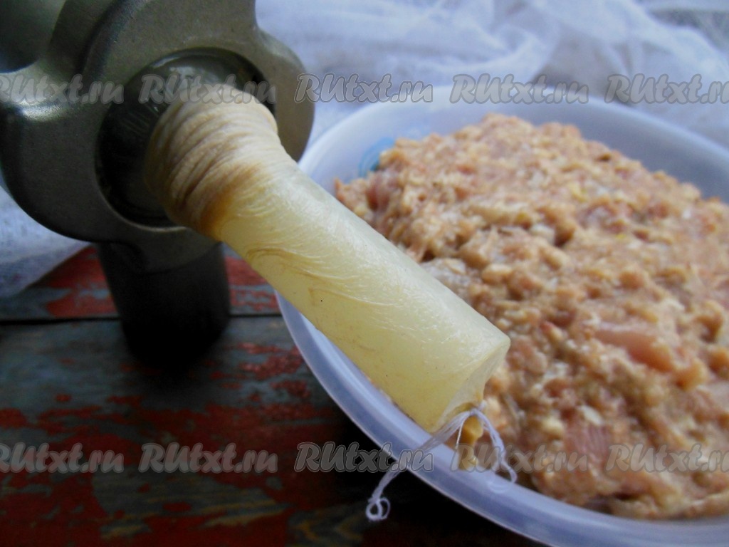 Оденьте кишку на специальную насадку для колбасок. Закрепите насадку на мясорубку, конец кишки завяжите ниткой. С помощью мясорубки наполните кишку подготовленным фаршем (если нет специальной насадки на мясорубку, можно наполнить кишку фаршем, вставив в кишку горлышко обрезанной бутылки).