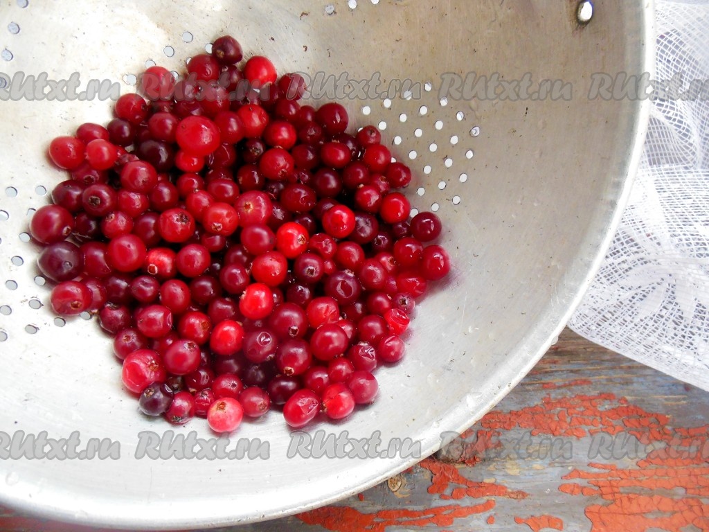 Ягоды клюквы промойте под проточной водой, выложите на дуршлаг, чтобы стекла лишняя жидкость. Можно дополнительно просушить на полотенце.