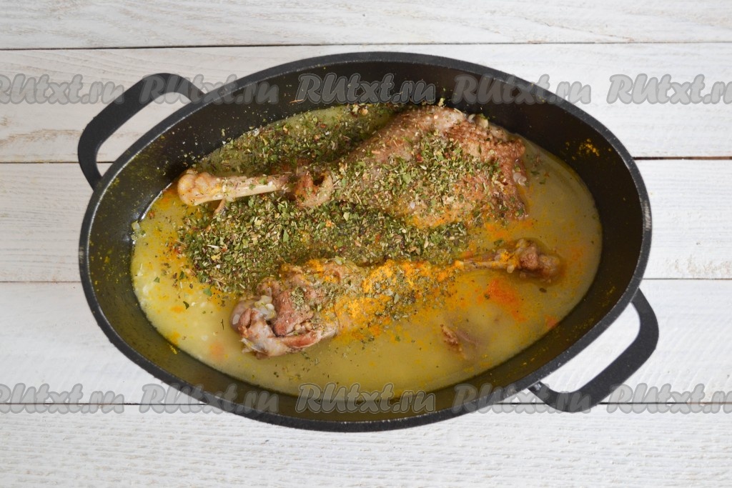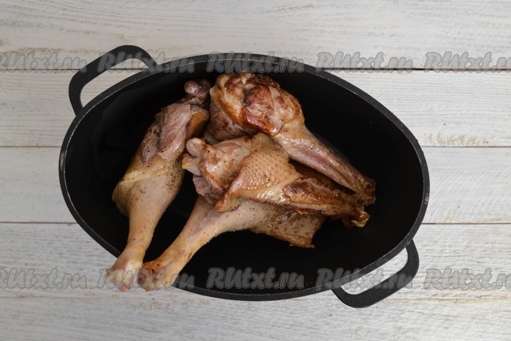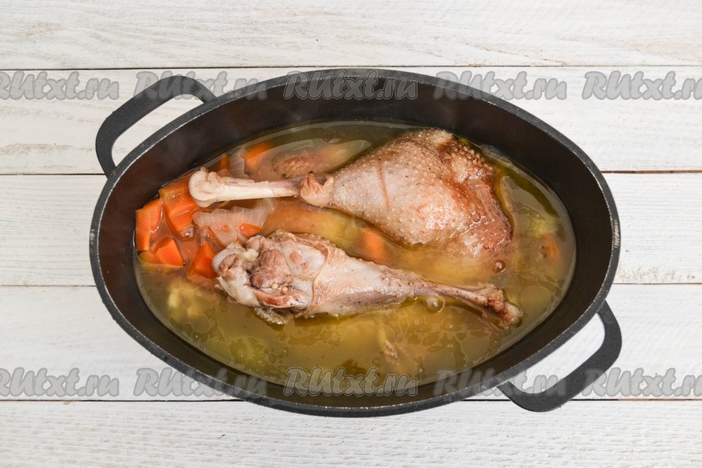 Влить воду и поставить на огонь. В момент закипания снизить огонь к минимуму, накрыть крышкой и оставить тушиться кусочки гуся на 45-55 минут.