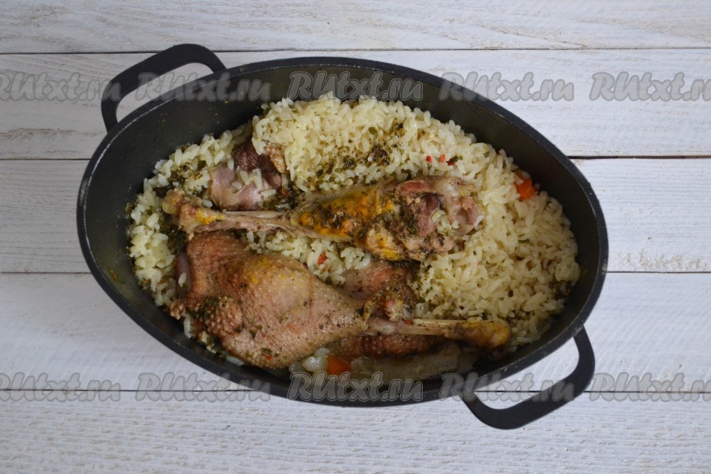 Казан накрыть крышкой и продолжить тушить кусочки гуся с рисом на слабом огне 35 минут.