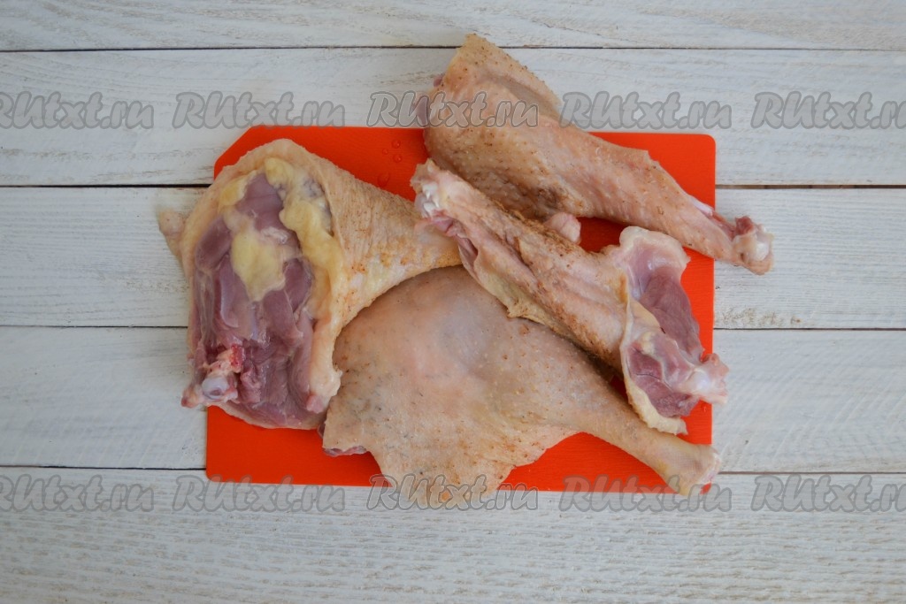 Вымыть тщательно гуся и снаружи, и внутри. Обтереть салфетками и разрезать на кусочки.