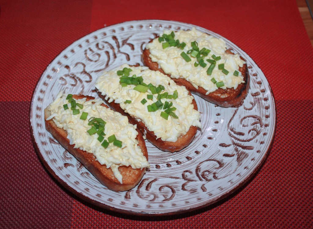 На каждый ломтик обжаренного хлеба выложить яично-сырную массу, распределить по всей поверхности.