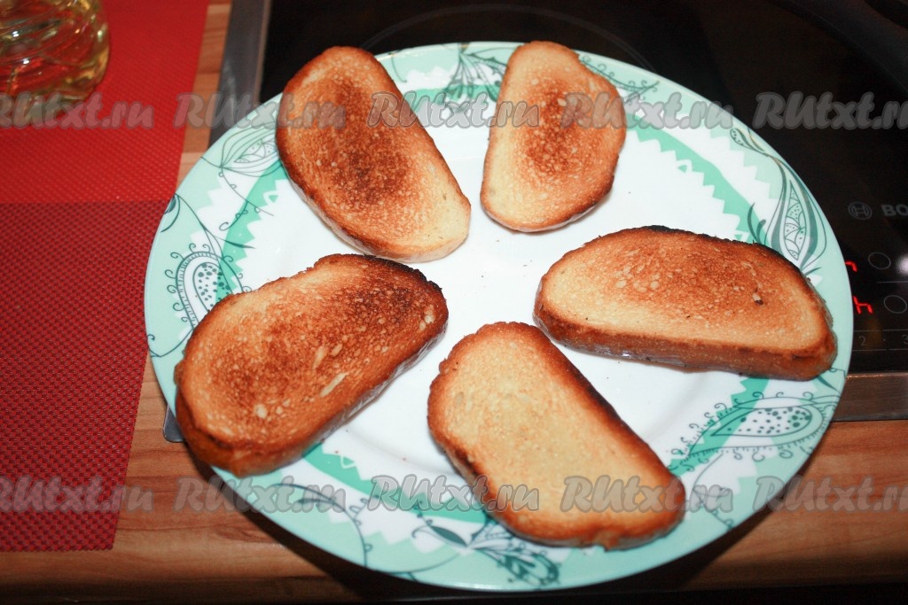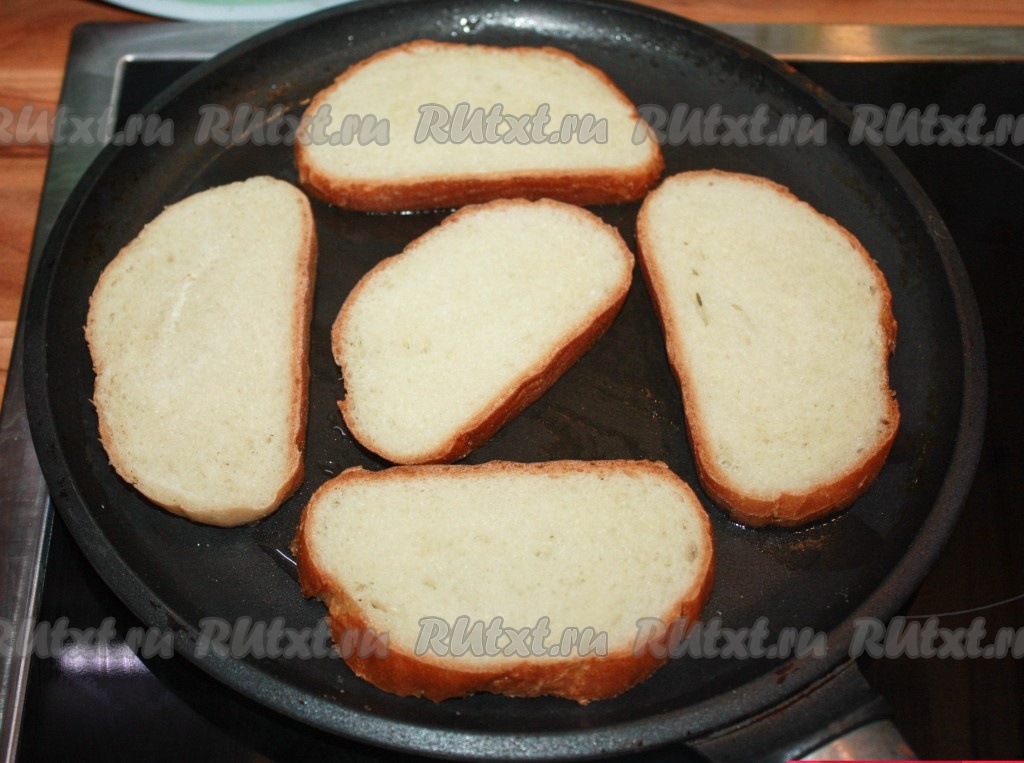 Ломтики хлеба обжарить на растительном масле с обеих сторон до золотистого цвета, но при этом не пересушить, чтобы мякиш внутри оставался мягким, а сверху была в меру хрустящая корочка.
