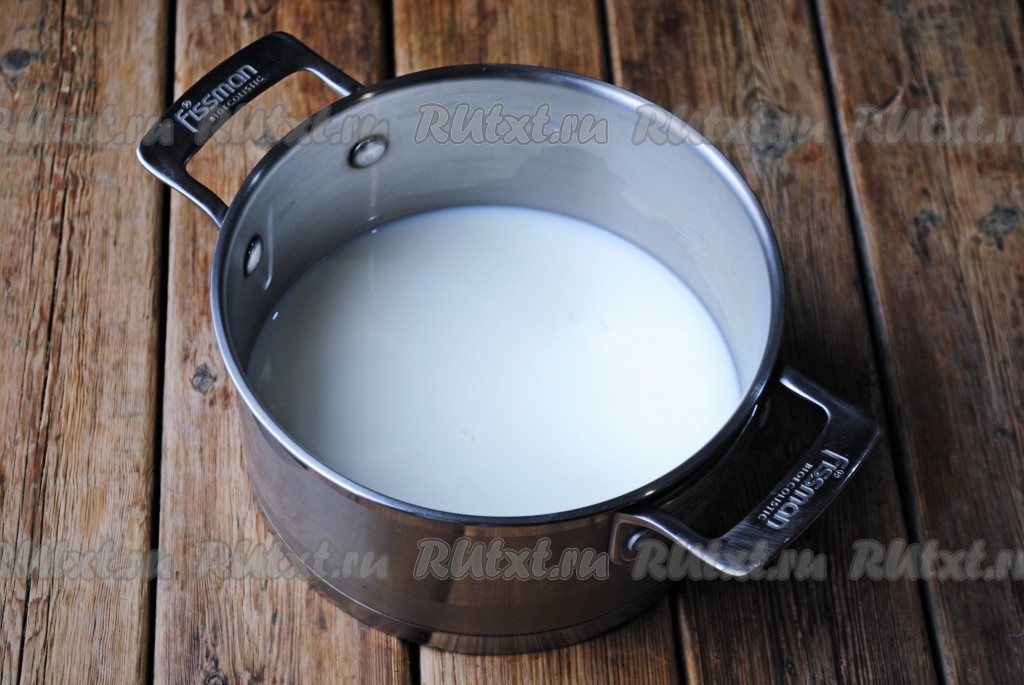 В кастрюльку влить молоко и, поставив на огонь, довести до кипения.