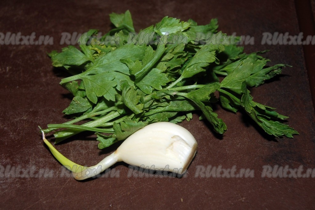 Приготовить петрушку и чеснок, мелко их нарезать.