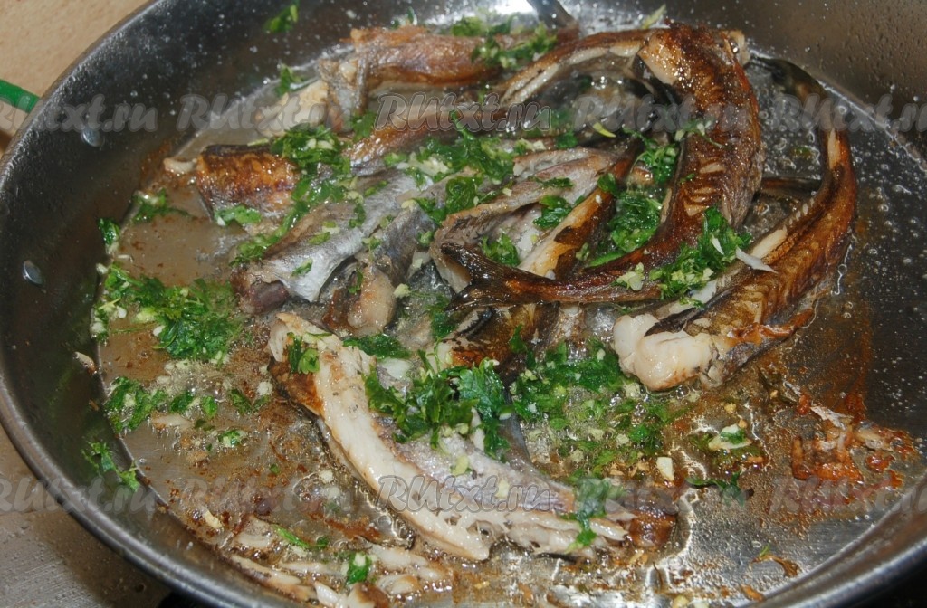 Добавить петрушку и чеснок прямо на сковородку, к уже приготовленной жареной рыбе.