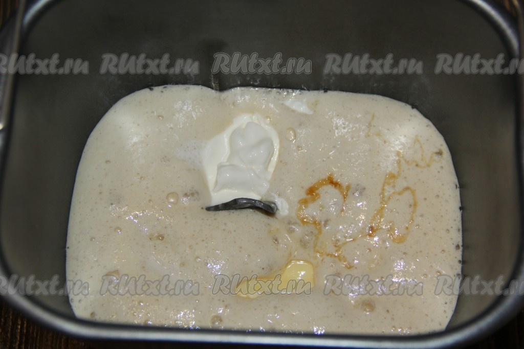 По истечении времени можно приступать к замешиванию теста, сделать это можно и вручную, и с помощью хлебопечки. Я замес теста сделала в хлебопечке, для этого в ведёрко влить опару, добавить яйца, растительное масло, растопленное не горячее сливочное масло, мёд и сметану. Затем добавить муку. Выставить режим "Замес теста" (в моей хлебопечке тесто замешивается 1,5 часа). Если замес теста делать руками, тогда в глубокой миске соединить опару, растительное и не горячее сливочное масло, яйца, мёд и сметану, слегка перемешать, затем, постепенно добавляя муку, замесить мягкое тесто. Накрыть миску пищевой плёнкой и оставить в тёплом месте часа на 1,5.