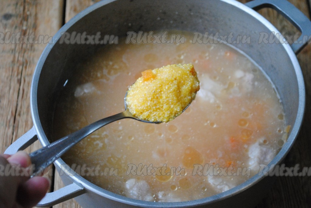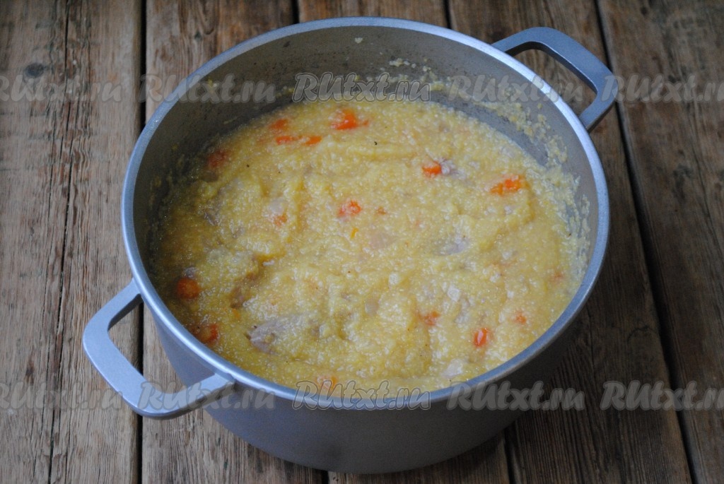 Когда мясо сварится (станет мягким), выложить к овощам и мясу кукурузную крупу, варить кашу, не накрывая крышкой, на небольшом огне в течение 10-15 минут, постоянно помешивая.