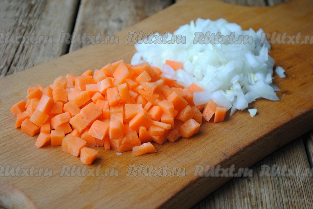 Нарезать небольшими кубиками очищенные лук и морковь.