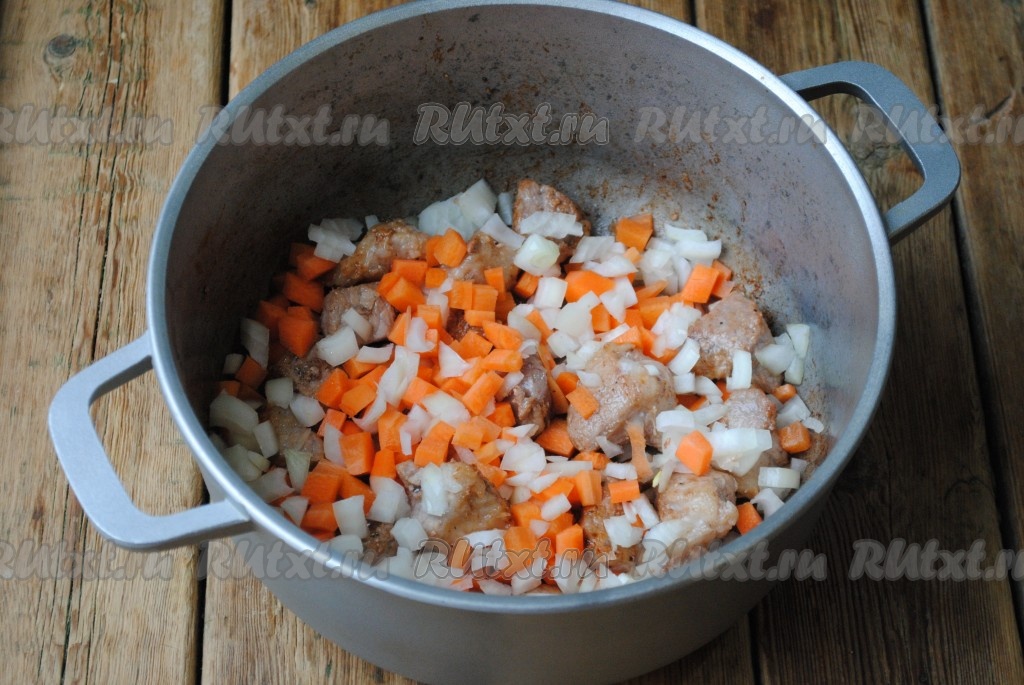 К обжаренному мясу выложить морковку с луком и готовить на среднем огне до мягкости овощей (минуты 2-3), помешивая.