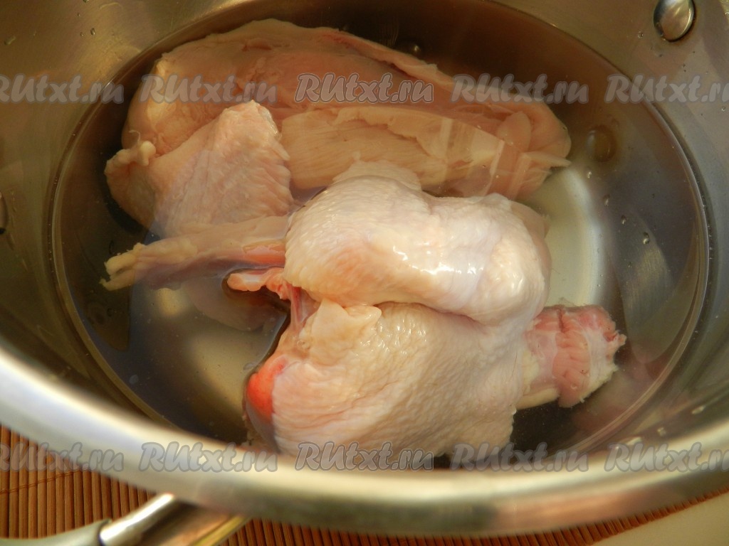 Куриное мясо положить в кастрюлю, залить водой и сварить бульон.