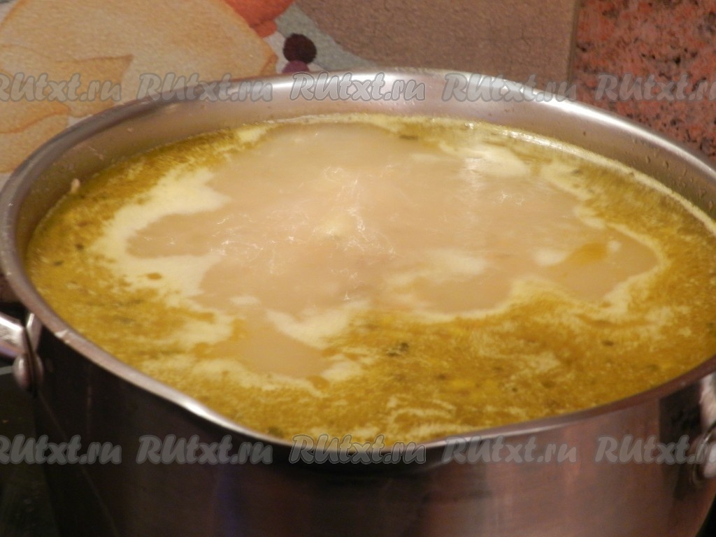 Когда бульон сварится, вытащить мясо, освободить от косточек и вернуть в бульон. Положить в него нарезанный кубиками картофель и перловую крупу. Немного посолить и варить суп до готовности картофеля. Затем переложить в кастрюлю с рассольником соленые огурцы, морковь и лук, довести до кипения и выключить.