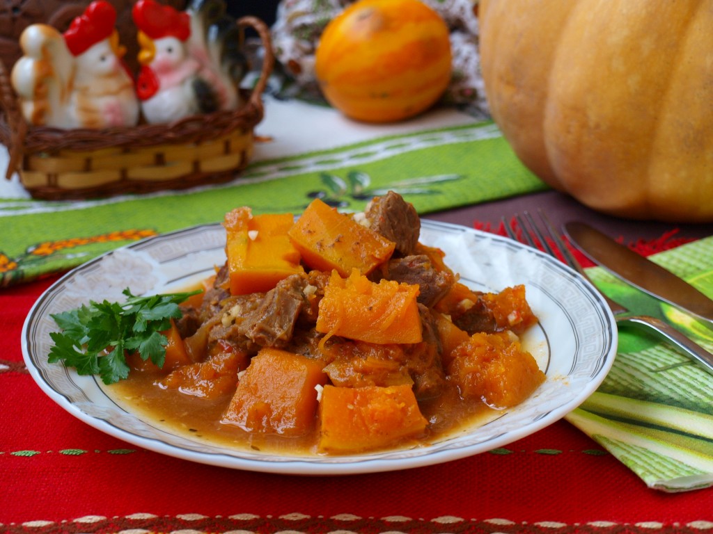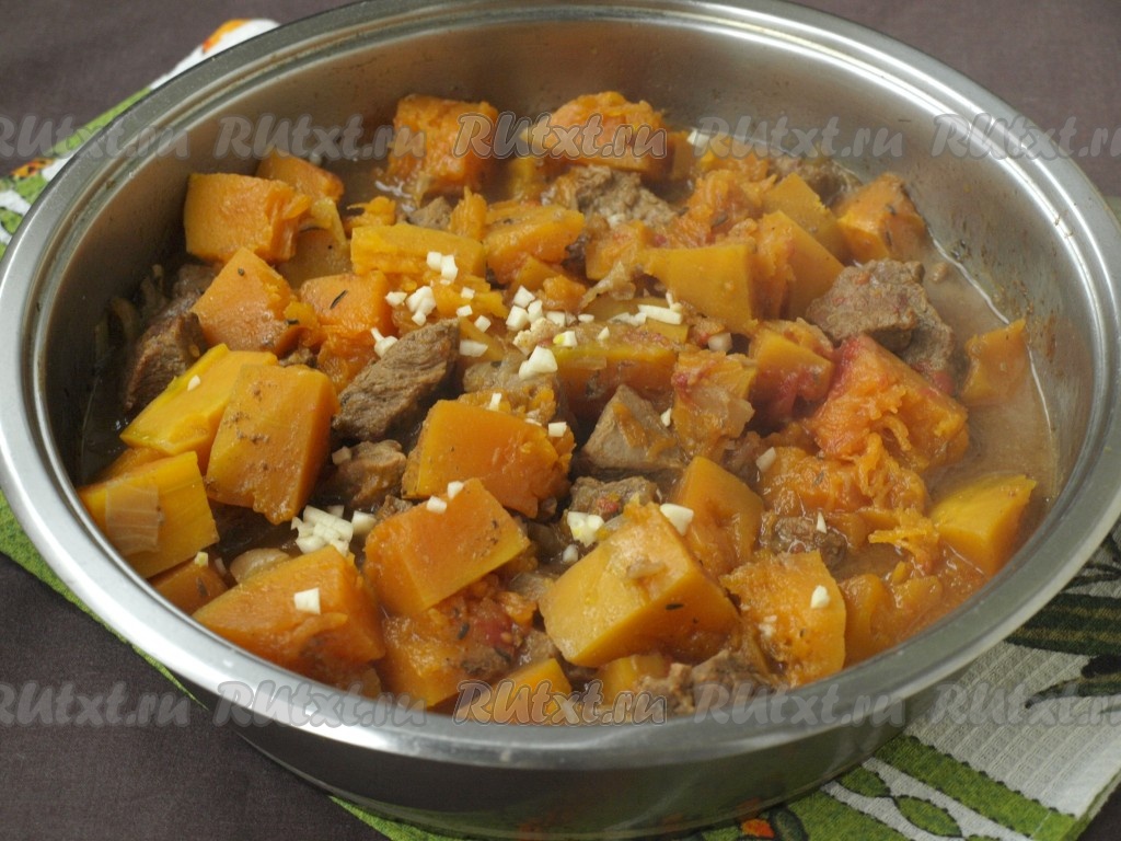 Через 5-10 минут говядину, тушёную с тыквой, можно подавать к столу. Блюдо получается полезным, сытным и вкусным, попробуйте!