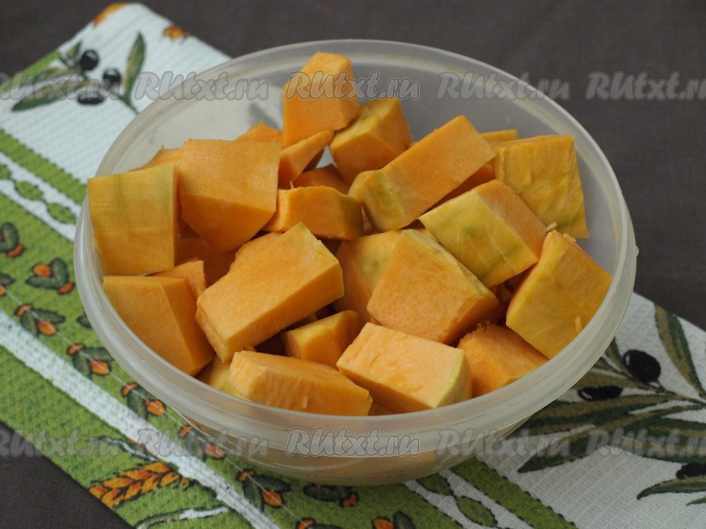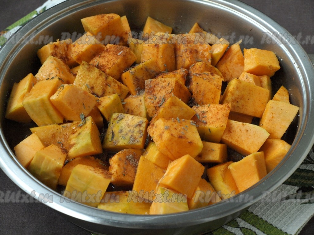 За это время нарезать крупными кубиками тыкву. Мелко нарезать не советую, если вам хочется, чтобы тыква не развалилась, а сохранила свою форму. Если нарезать мелко, тыква превратится в соус - это тоже вкусно, но не так красиво.